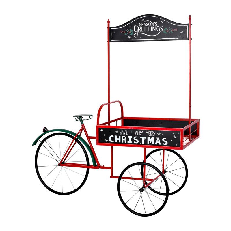 Αυτό το τρίκυκλο ποδήλατο, με ρετρό αισθητική, διαθέτει μια ξύλινη κατασκευή στο μπροστινό του μέρος που λειτουργεί ως καλάθι ή βιτρίνα. Το καλάθι φέρει διακοσμητικό μήνυμα “HAVE A VERY MERRRY CHRISTMAS” στο πάνω τμήμα του και καλλιτεχνικές λεπτομέρειες με λευκά γράμματα και εορταστικά μοτίβα στις πλευρές του, κάνοντάς το ιδανικό για εορταστική διακόσμηση.