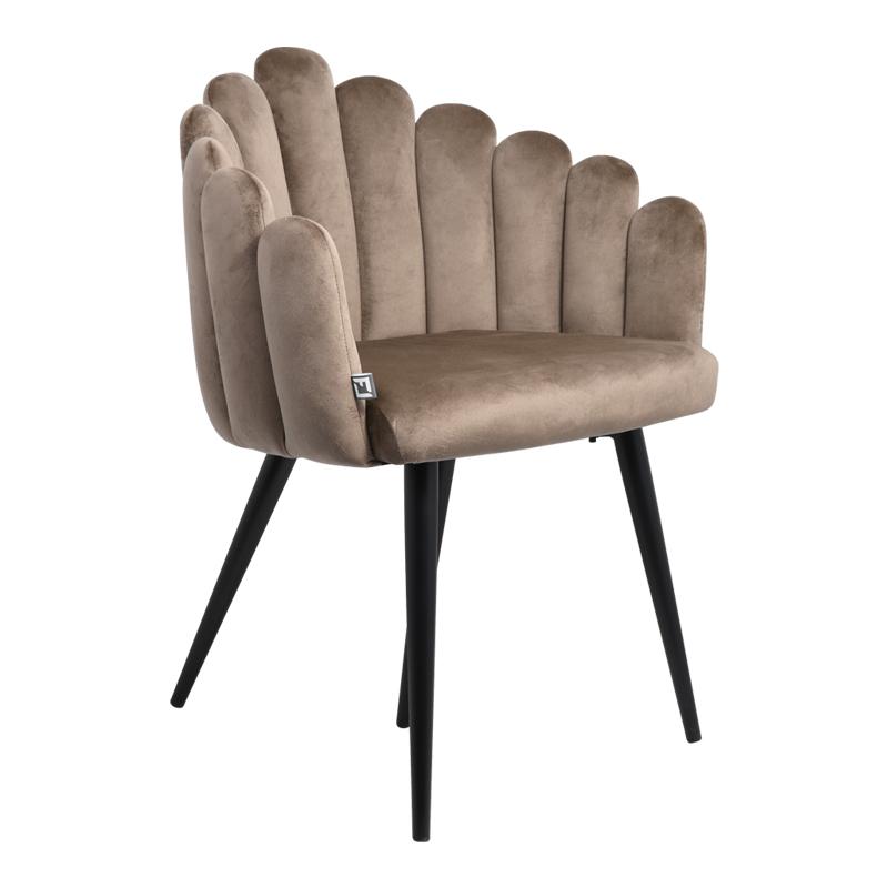 Η καρέκλα συνδυάζει το κλασικό στυλ του βελούδου με μια σύγχρονη, γλυπτική αισθητική που θυμίζει αρχιτεκτονική δεκαετίας ’60. Τα λεπτά, γωνιώδη μαύρα πόδια δημιουργούν έντονη αντίθεση με την καμπυλωτή φόρμα του καθίσματος, προσδίδοντας στην καρέκλα μια ισορροπημένη, διαχρονική εμφάνιση που μπορεί να συμπληρώσει διαφορετικούς διακοσμητικούς χώρους.