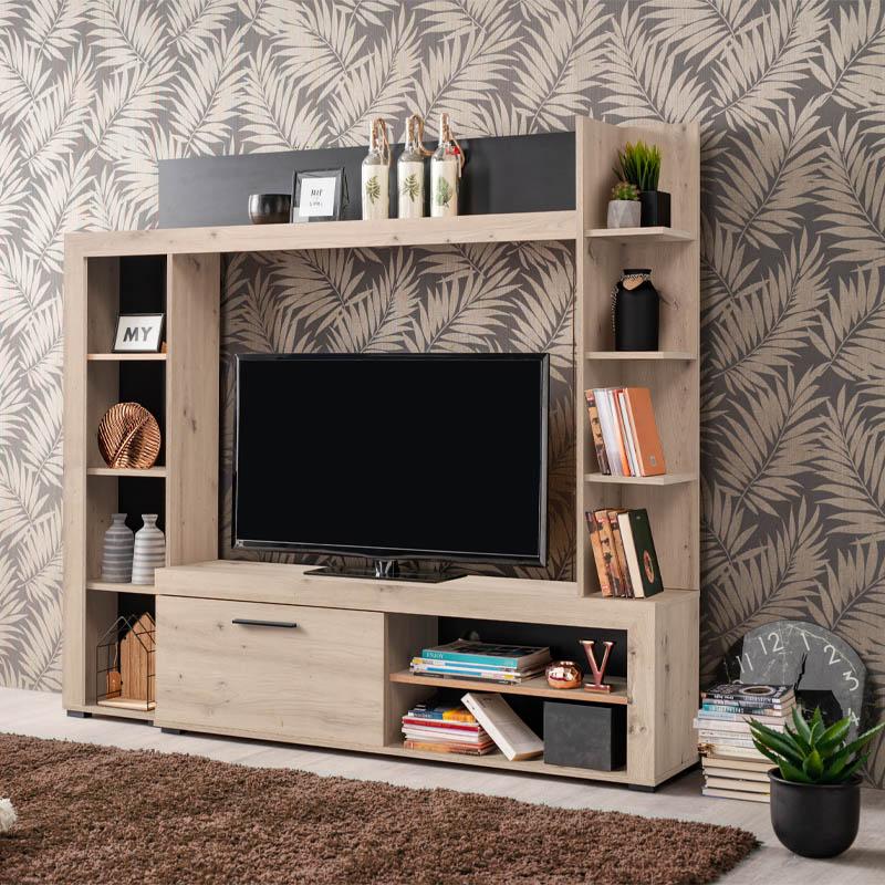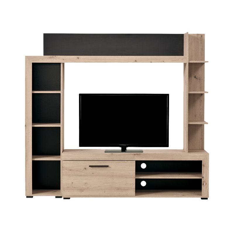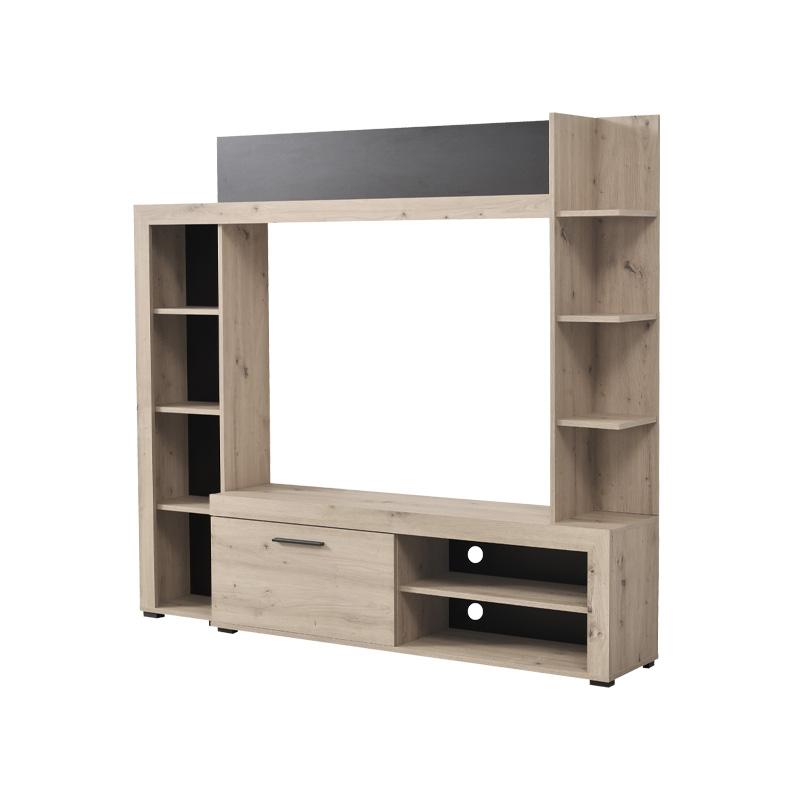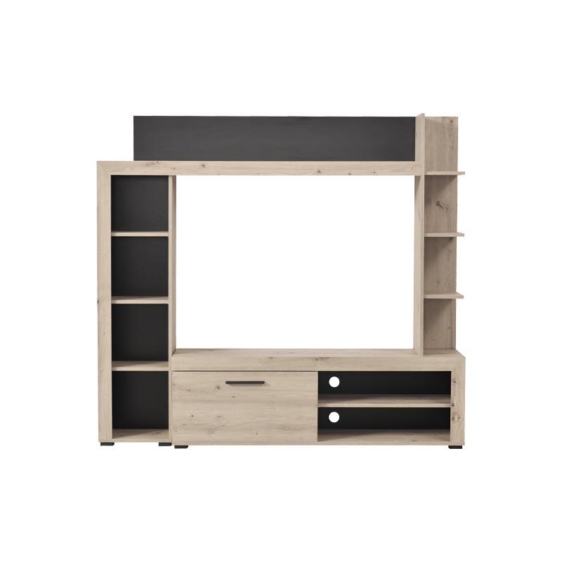 Η σύνθεση τηλεόρασης προσφέρει τον λειτουργικό χώρο για την τοποθέτηση της τηλεόρασης και αποτελεί ταυτόχρονα διακοσμητικό στοιχείο του χώρου σας. Η σύνθεση Rubi αποτελείται από ράφια στο δεξιό και το αριστερό τμήμα, ώστε να μπορείτε να τοποθετήσετε τα αγαπημένα σας διακοσμητικά. Επιπλέον, διαθέτει ένα ευρύχωρο ντουλάπι στο κάτω μέρος για να μπορείτε να αποθηκεύσετε τα αντικείμενα σας. Ιδανική για όλους τους σύγχρονους χώρους, μικρούς και μεγάλους.