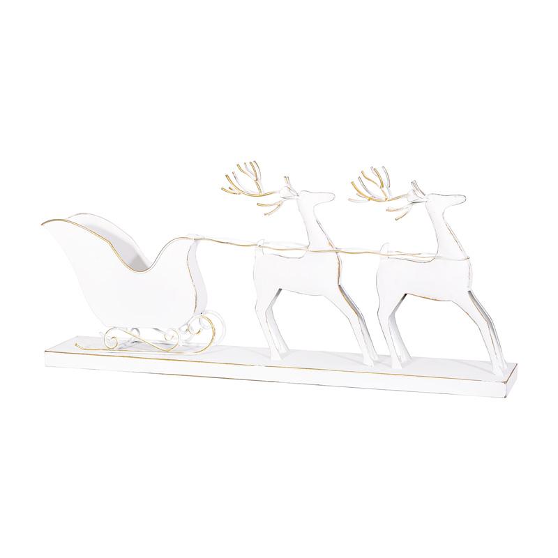 Αναδείξτε την κομψότητα των γιορτών με αυτό το εντυπωσιακό διακοσμητικό τάρανδο με έλκηθρο, κατασκευασμένο από υψηλής ποιότητας μέταλλο και διακοσμημένο σε χρυσό χρώμα. Αυτό το διαχρονικό σχέδιο συνδυάζει την παραδοσιακή χριστουγεννιάτικη ατμόσφαιρα με μια μοντέρνα, εκλεπτυσμένη πινελιά.