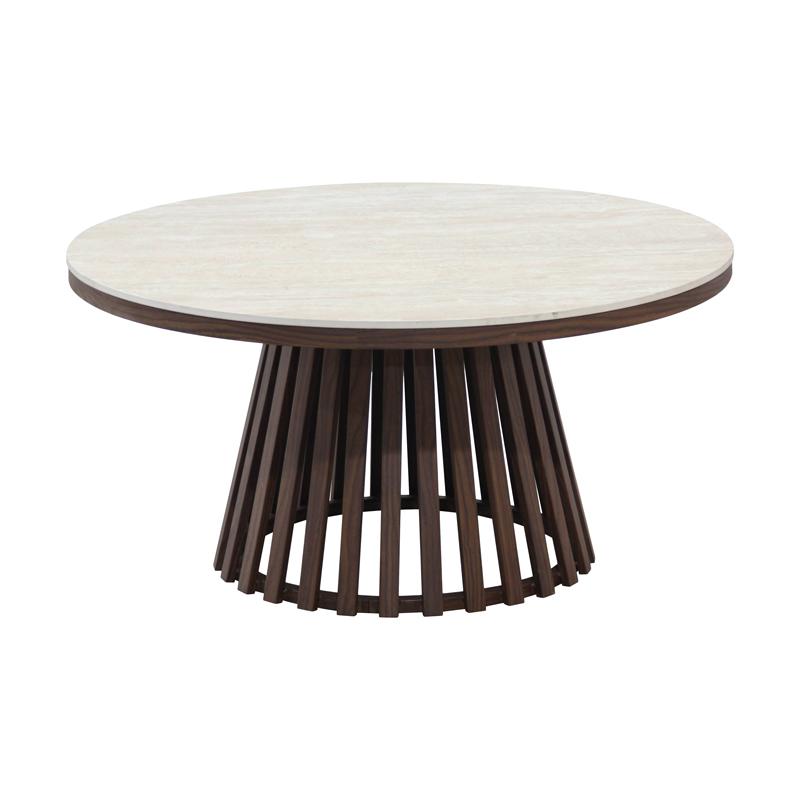Το τραπέζι στηρίζεται σε μια εντυπωσιακή μεταλλική βάση, τοποθετημένη στο κέντρο, η οποία αποτελείται από πολλές δοκούς σε κυκλική διάταξη. Οι δοκοί είναι τοποθετημένοι με ακτινωτό τρόπο, ξεκινώντας από το κάτω μέρος της βάσης και καταλήγοντας προς την κεραμική επιφάνεια, δημιουργώντας μια αίσθηση σταθερότητας και ισορροπίας.